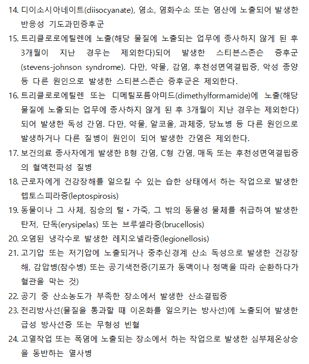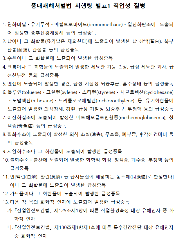 직업성 질병의 구체적인 범위에서 안전보건조치 의무 위반이 질병으로 이어지는 인과관계가 분명해야 하기 때문에 급성 중독이 기준이 되었고, 그에 따라 심혈관계 질환, 직업성 암이나 근골격계 질환 등에 대해서는 포함시키지 않게 되었습니다.