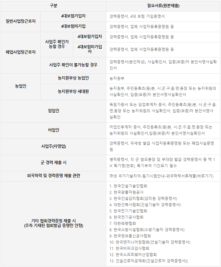 경력증명서의 경우 일반사업장 근로자, 폐업사업장 근로자, 농업인, 임업인, 어업인, 사업주, 군 경력, 외국학력 및 외국 경력 그리고 기타 협회 경력 증빙 등을 제출할 수 있습니다. 업종에 따라 제출해야 하는 서류 종류도 다르기 때문에 위 표를 정확히 확인해보고 하기 바랍니다.