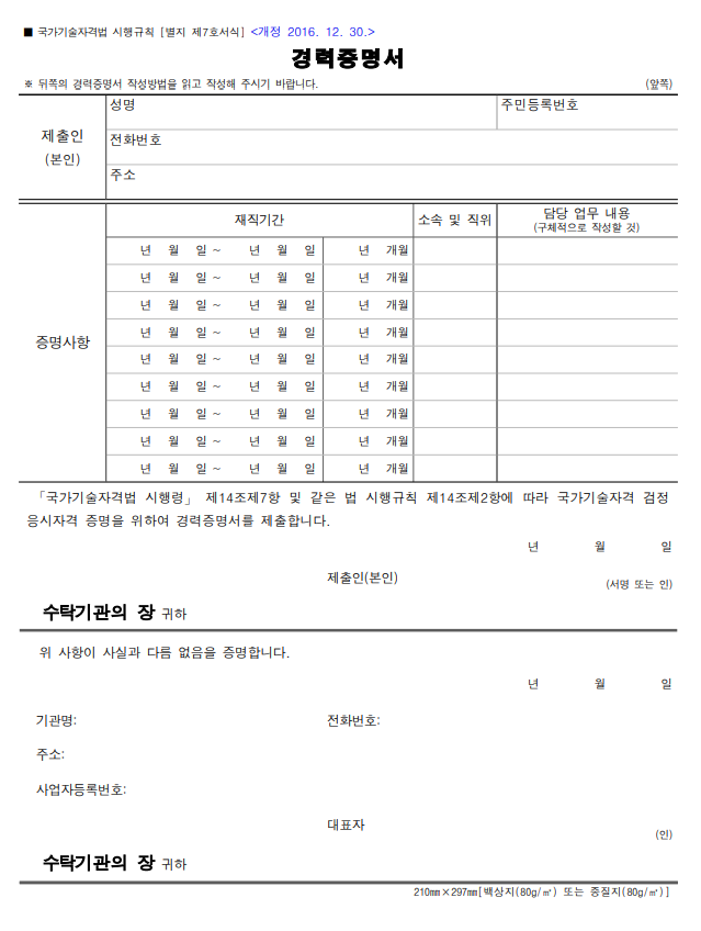1. 국가기술 자격법 별지 7호 서식 경력증명서