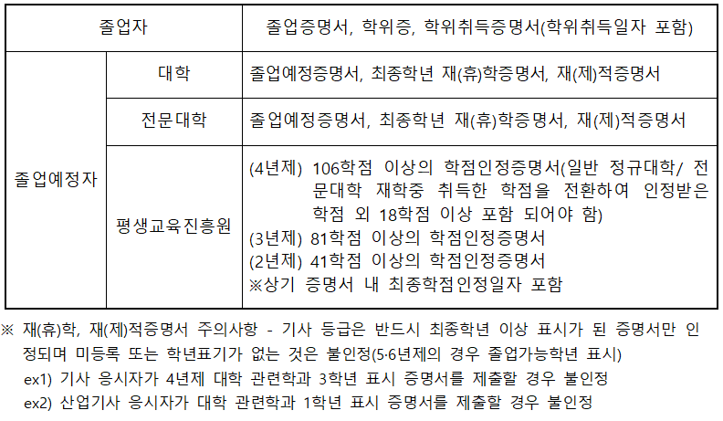 기사 또는 산업기사 자격증 등 학력 기준만 있는 경우 졸업증명서, 학위증, 학위 취득 증명서 등을 준비해야 하는데요. 졸업 예정자의 경우 최종 학년 이상 표시된 증명서만 인정되므로 제출 전 꼭 확인하기 바랍니다.