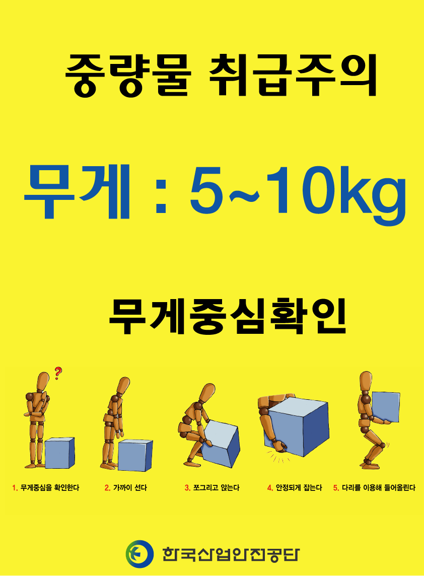 산업안전보건기준에 관한 규칙에는 『중량물을 들어올리는 작업에 관한 특별 조치』라는 절이 있습니다. 법에서는 중량물에 대한 정확한 정의는 하지 않고 있으며, 무게가 있는 모든 물체를 대상으로 중량물로 보고 관리하도록 하고 있는데요. 특히 5kg 이상의 중량물의 경우 추가로 중량물 취급주의 표지를 하도록 정하고 있습니다.