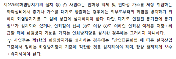 관련 법 조항으로 산업안전보건 기준에 관한 규칙 제269조에서 화염 방지기(Flame Arrestor, FA)에 대한 사항을 정하고 있다.