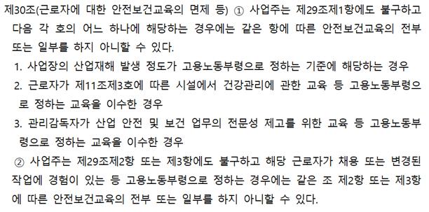 산업안전보건법 제30조(근로자에 대한 안전보건교육의 면제 등)에서는 특정 조건에서 근로자 정기교육의 전부 또는 일부를 하지 않도록 정해주고 있다.