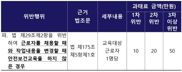근로자 1명당 채용 시 교육을 실시하지 않으면 1차 위반에 10만 원, 2차 위반에 20만 원 3차 위반에 50만 원으로 1명당 발생하는 금액이다.
