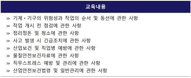 그리고 현장에 배치되는 경우가 많다. 그러나 위 내용이 필수이기는 해도 근로자의 안전관 산업재해 예방을 위해서라도 안전에 대한 교육을 실시해야 한다. 따라서 여기에 실제 사업장에서 취급하는 설비나 물질에 대한 안전교육도 실시해야 한다. 교육 내용 또한 이미 정해져 있으므로 누락되지 않도록 해야 한다.