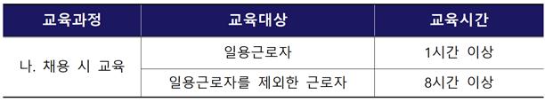 근로자 채용 시 교육은 말 그대로 근로자를 채용했을 경우 사업장에 배치하기 전 실시해야 하는 교육이다. 일용직 근로자가 아닌 경우 8시간 이상의 교육을 실시해야 하므로, 하루 8시간, 주 40시간 근로한다고 하면 출근 후 퇴근할 때 까지 하루 종일 교육을 받아야 한다.
