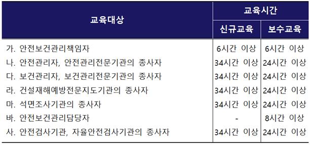 위와 같이 안전 보건 관리 책임자는 신규교육으로 6시간, 보수교육으로 6시간 이상 받아야 한다.