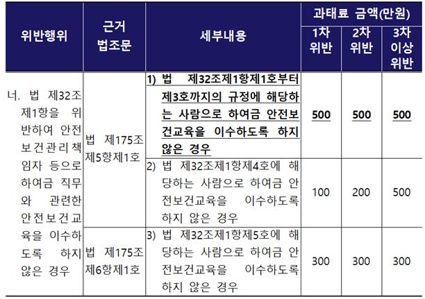안전 보건 관리 책임자에 대한 직무 교육을 실시하지 못한 경우 과태료 500만원 대상이다. 500만 원이면 업체에서는 큰돈이 아닐 수 있지만, 안전 관리에 가장 기본적인 교육에 대한 누락으로 안 좋은 인상이 남을 수 있으니 주의해야 한다.