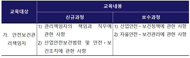 안전 보건 관리 책임자 직무 교육 내용은 다음과 같다.