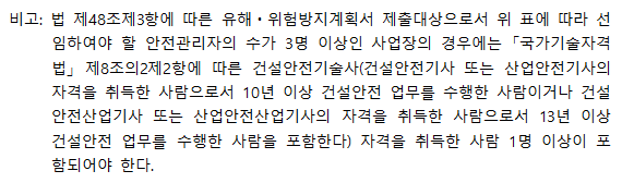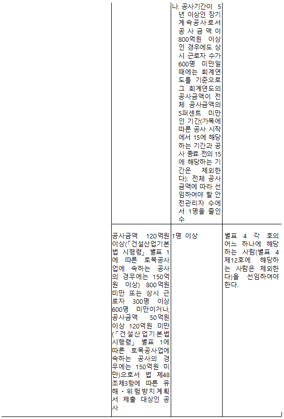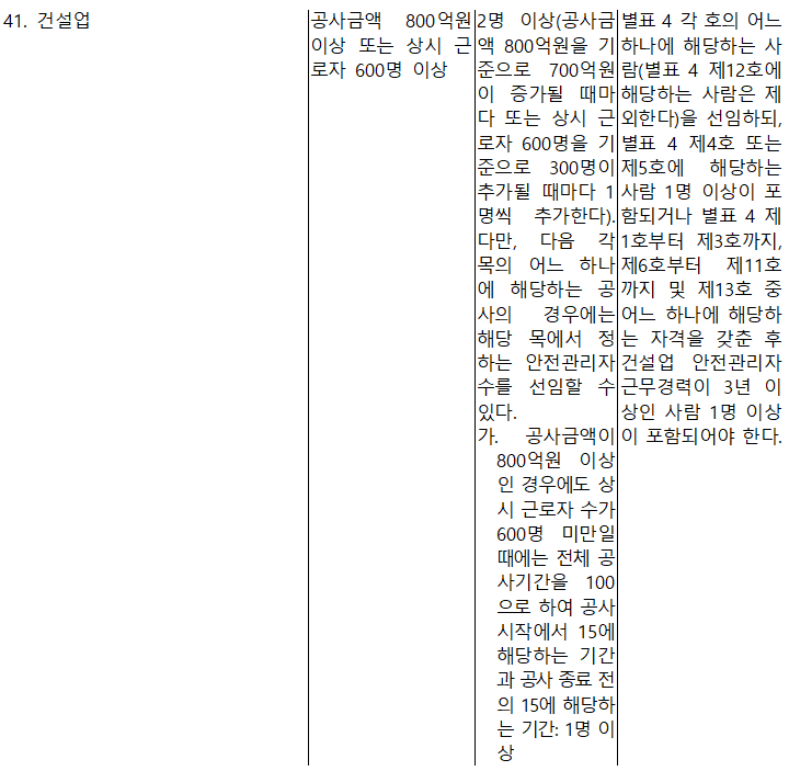 그리고 상시근로자 300인 이상인 경우 안전 관리자, 건설업의 경우 공사금액 120억 원 이상 또는 토목공사업의 경우 150억 원 이상은 안전 관리자는 안전 관리 업무만 전담해야 한다. 다른 업무를 하다가 걸리면 그것도 법 위반이니 다른 업무를 하지 않거나 하더라도 흔적을 남기지 않아야 한다.