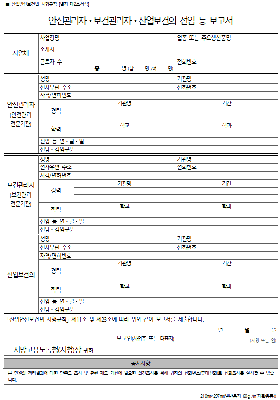 제출을 해야 선임으로 인정되기 때문에 인력이 변경되거나 새로 선임하는 경우 아래 양식에 맞춰 선임 보고서를 작성해야 한다.