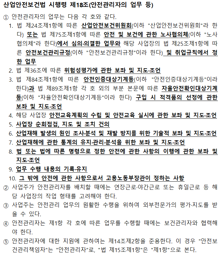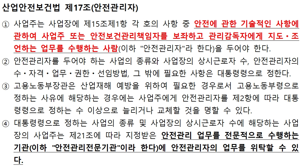 산업 안전 보건법 제17조에는 안전 보건 관리 책임자를 보좌하고, 관리 감독자에게 지도 및 조언을 하도록 하는 안전 관리자를 선임하도록 정하고 있다.