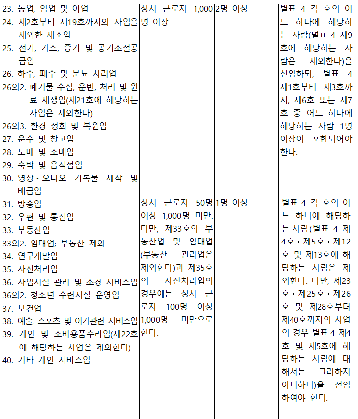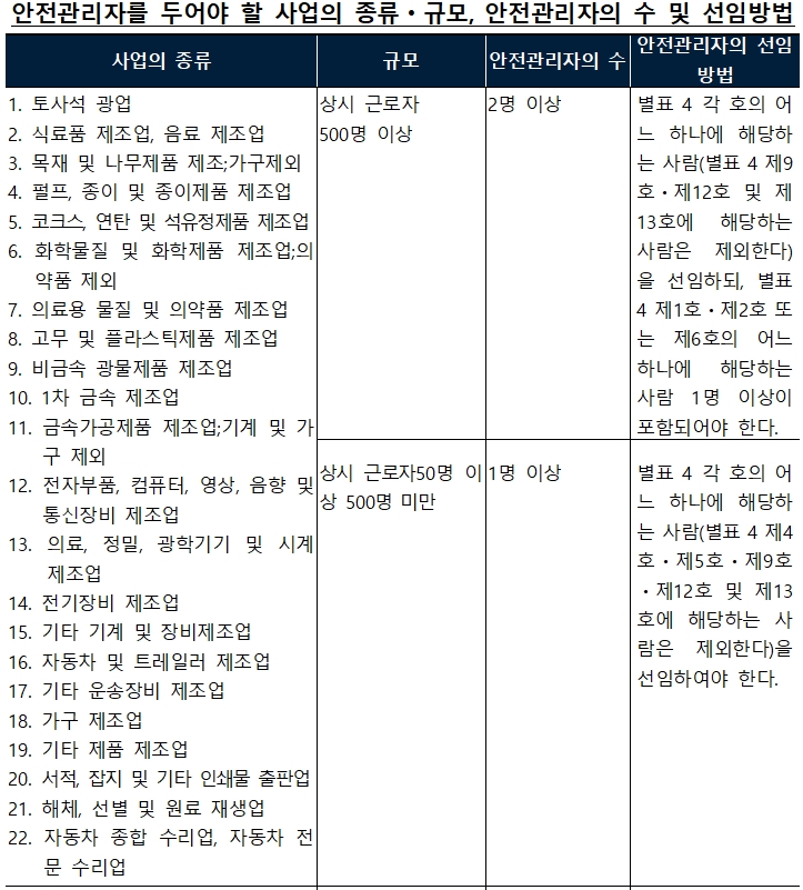 산업 안전 보건법에서 안전 관리자를 선임해야 하는 대상은 다음과 같다.