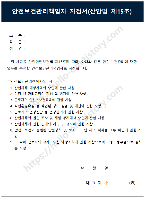 해당 인원을 안전 보건 관리 책임자로 지정한다는 사실과, 법에서 정하고 있는 직무의 내용, 그리고 이를 확인하는 대표이사의 직인 날인은 법에서 요구하는 수준에 맞도록 작성되어야 한다.
