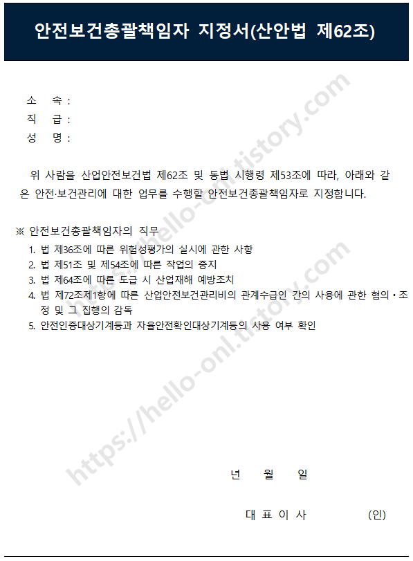안전 보건 총괄 책임자는 말 그대로 모든 관리를 총괄하는 사람으로 안전 보건 관리 책임자가 지정되는 경우 안전 보건 총괄 책임자의 업무까지 수행해야 한다. 그래서 내부 지정 문서도 안전 보건 관리 책임자와 총괄 책임자 지정서 각각 비치해야 한다.