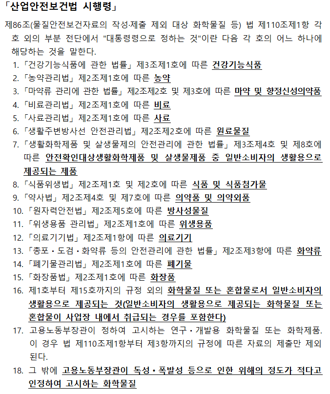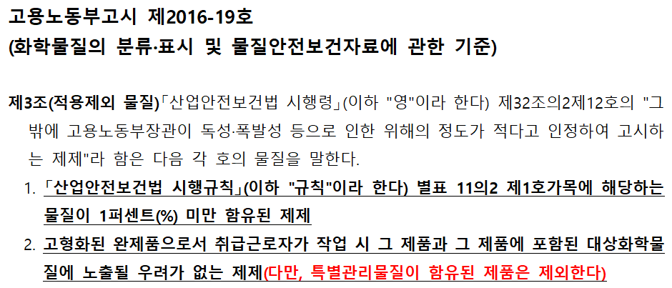 하지만 단서조항으로 특별 관리 물질에 대해서는 다시 제외가 되었다. 즉 고형화 된 완제품으로 노출될 우려가 없으나, 그 안에 특별 관리 물질이 포함되어 있다면 이는 다시 대상이 된다.