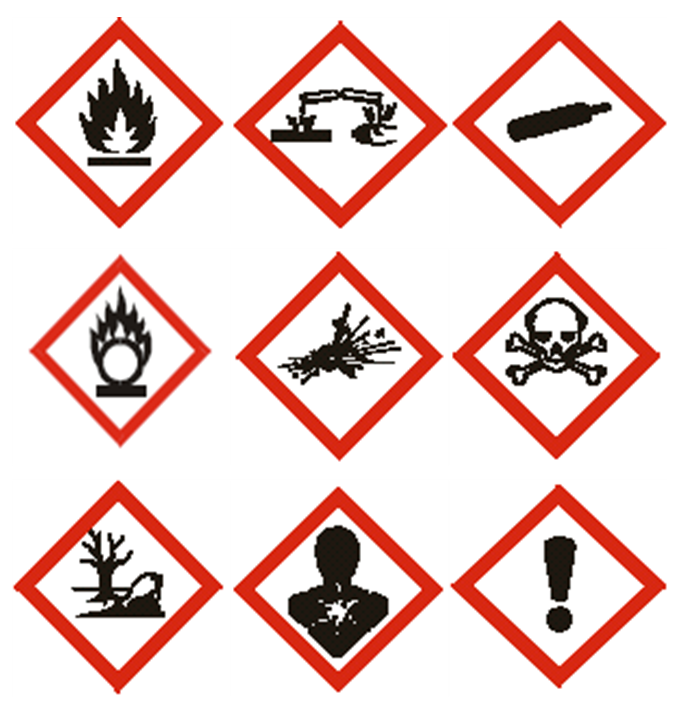 그림문자는 아래와 같은 모양을 갖는다. 물질 안전 보건 자료와 동일하도록 선정하여 그림 문자를 선택해야 한다.