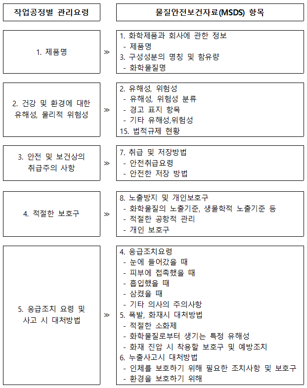 각각의 항목은 물질 안전 보건 자료를 참조하여 만들면 된다. 이렇게 요악되어 있는 정보를 게시하면 관리 요령으로 게시된 사항으로 인정받을 수 있다.