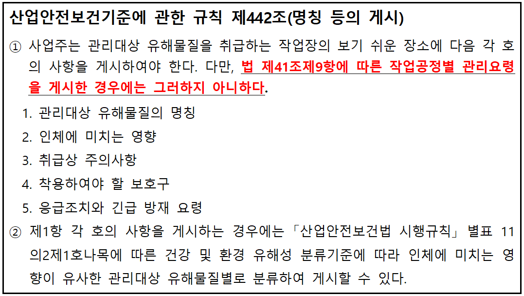 한 가지 더, 산업 안전 보건 기준에 관한 규칙 제442조(명칭 등의 게시)에 따르면 관리 대상 유해 물질을 취급하는 경우 해당 물질에 대해 게시해야 한다. 하지만 공정별 관리 요령을 게시하면 제외되므로 관리 요령을 게시하는 것이 좋다.