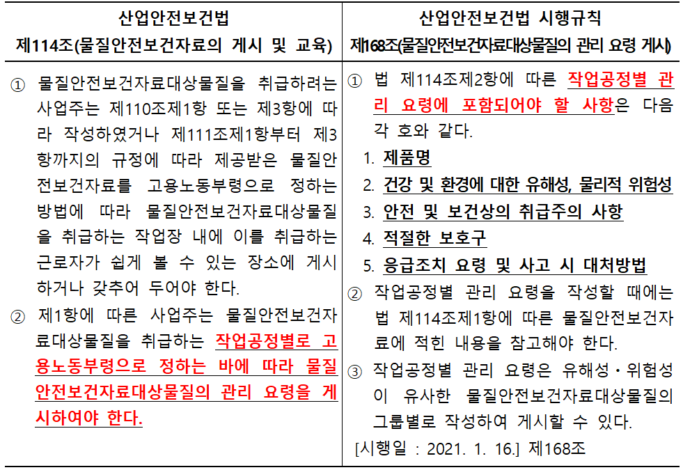 산업안전보건법 제114조(물질안전보건자료의 게시 및 교육)에 따라 물질안전보건자료대상물질을 취급하는 경우 취급하는 작업 공정별로 관리 요령을 게시하도록 정하고 있습니다. 또한 산업안