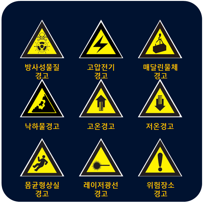 산업 안전 보건법에서 가장 많은 표시중 하나는 바로 경고 표지 일 것이다. 사용하는 물질의 용기에 대한 경고 표지는 물론 이런 물질을 취급하는 경우 별도의 경고 표지를 부착해야 하기 때문이다.