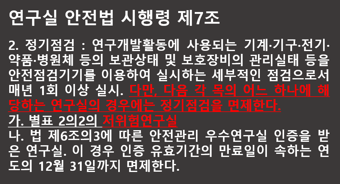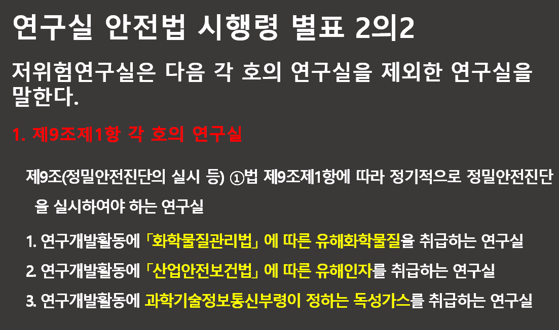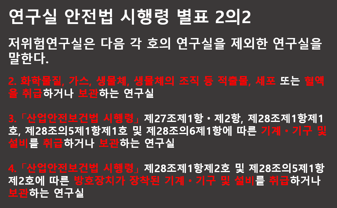 하지만 모든 연구실이 대상은 아니고 법에서 정하는 저위험 연구실만 적용 대상이 되기 때문에, 저위험 연구실의 조건에 대해서 알아보았다.