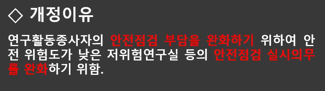매일 연구 개발 활동을 수행하기 전 해야 하는 일상 점검을 일주일에 한 번만 실시해도 인정해 주는 내용은 연구실 안전 관리 담당자와 연구실 책임자의 입장에서는 굉장히 솔깃할 수밖에 없다. 또한 연구실을 총괄적으로 관리하는 연구주체의 장이나 연구실 안전환경관리자에게는 정기 점검을 실시하지 않아도 된다는 사실이 솔깃할 것이다.