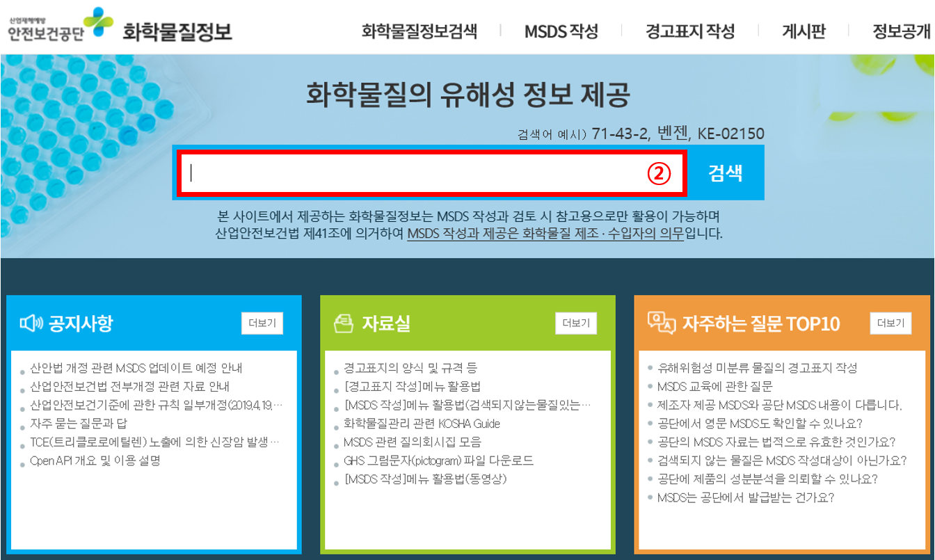 - 인터넷 검색창에 안전보건공단 화학물질정보 또는 물질안전보건자료를 검색한다.